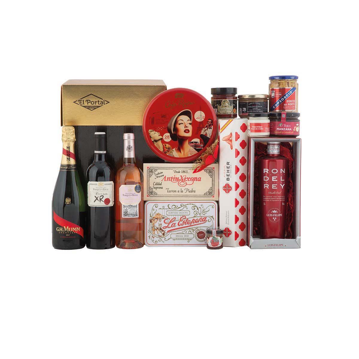 Botella 75 cl. Vino Espumoso Cuvee Brut EL BESO DEKLIMT ( 1 ud )Botella 70 cl. Whisky Escocés Single Malt TOMATIN LEGACY «Mejor Whisky del Mundo» 99/100 ( 1 ud )Botella 70 cl. Premium London Dry THE STING SMALL BATCH G´OLD TOM (Mejor Ginebra del Mundo 2025) ( 1 ud )Botella 35 cl. Licor de Bombón «Gold» MOZART ( 1 ud )Botella 75 cl. Vino Rioja Tinto Gran Reserva CAMPILLO ( 1 ud )Barra 250 gr. Turrón Jijona Calidad Suprema «Elaboración Artesanal» EL NACIMIENTO ( 1 ud )Estuche 350 gr. Pan de Cádiz Calidad Suprema LA TRADICION ( 1 ud )Estuche 160 gr. Mantecadas (12 ud) de Navarra CASA SALINAS ( 1 ud )Barra 300 gr. Chocolate con Leche y Almendras «Gama Oro» LINDT ( 1 ud )Estuche 337 gr. Bombón «Dulces Deseos» LINDT ( 1 ud )Tarro 180 gr. Almendra Garrapiñada «Artesana» FRUTOS SECOS AURO ( 1 ud )Pieza 400 gr. Aprox. Salchichón Ibérico Bellota con P.X. de la «Sierra de Aracena» LOS CAPRICHOS DEL PORTAL ( 1 ud )Pieza 450 gr. Aprox. Queso Artesano de Leche Cruda ROQUE ( 1 ud )Lata 120 gr. Delicatessen de Hígado de Bacalao TELA MARINERA ( 1 ud )Lata 74 gr. Anchoa del Cantábrico en Aceite de Oliva «Serie Oro» CONSORCIO ( 1 ud )Tarro 125 gr. Foie Gras Entero de Pato DUC DE PRESSAC ( 1 ud )Lata 300 gr. Crema de Membrillo Casera con Nueces Extra LA ABUELA FILO ( 1 ud )Botella 50 cl. Aceite de Oliva Virgen Extra «Oleum Artis» de MARQUES DE GRIÑON ( 1 ud )Estuche Lujo ( 1 ud )