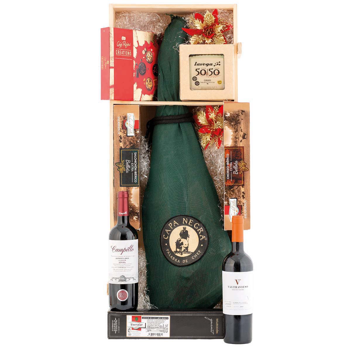 Botella 75 cl. Vino Ribera de Duero Tinto Reserva «Finca la Atalaya» VALTRAVIESO ( 1 ud )Botella 75 cl. Vino Rioja Tinto Gran Reserva CAMPILLO ( 1 ud )Estuche 160 gr. Mantecadas (12 ud) de Navarra CASA SALINAS ( 1 ud )Pieza 450 gr. Aprox. Lomito Ibérico Bellota 959 CONSORCIO DE JABUGO ( 1 ud )Pieza 900 gr. Aprox. Queso Artesano de Leche Cruda ROQUE ( 1 ud )Jamón de Bellota 100% Ibérico (Peso 6,5-7 Kg. Aprox.) 959 CONSORCIO DE JABUGO ( 1 ud )Aceitera 50 cl. Aceite de Aragón Oliva Virgen Extra SOMONTANO ( 1 ud )Caja Jamonera Madera ( 1 ud )