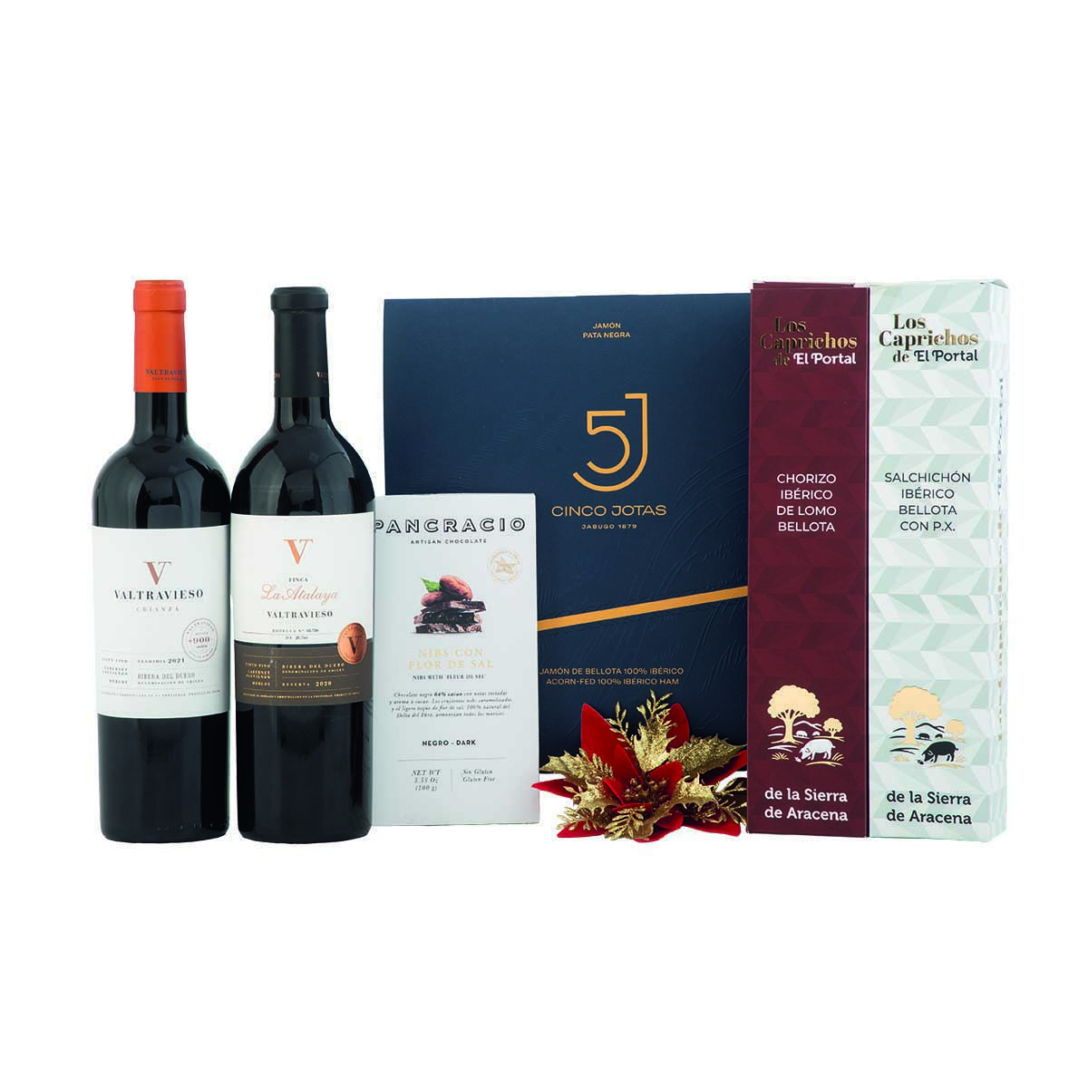 Availability: In StockBotella Magnum 1,5 L. Vino Ribera de Duero Tinto Crianza VALTRAVIESO ( 1 ud )Tableta 100 gr. Chocolate Negro con Flor de Sal PANCRACIO ( 1 ud )Tarro 120 gr. Bloc de Foie Francés de Pato COMTE DE LA SEYNIE ( 1 ud )