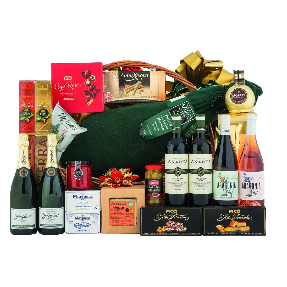 Botella 75 cl. Brut Francés COMTE DE CHAMBERI ( 1 ud )Botella 75 cl. Vino Tinto Joven MARQUES DE ROCAS ( 1 ud )Botella 75 cl. Vino Blanco Joven MARQUES DE ROCAS ( 1 ud )Estuche 150 gr. Surtido de Turrones Calidad Suprema «Etiqueta Roja» ANTIU XIXONA ( 1 ud )Estuche 48 gr. Neula Tradicional RIFACLI ( 1 ud )Estuche 150 gr. Caprichos de Navidad LA CONFITERA ( 1 ud )Bolsa 25 gr. Gominolas Surtidas HARIBO ( 1 ud )Estuche 53 gr. Bombones de Chocolate con Leche «Cofres» TRAPA ( 1 ud )Bolsa 30 gr. Patatas Fritas Artesanas con Aceite de Oliva y Sal Marina «Crujiente Navidad» PAFRITAS ( 1 ud )Bolsa 25 gr. Pétalos de Pan con Aceite de Oliva DAVID DE CASTRO GOURMET ( 1 ud )Sobre 55 gr. Jamón Serrano Gran Reserva CAMPODULCE ( 1 ud )Tarrina 70 gr. Crema de Jamón Ibérico ESENCIA Y SABOR ( 1 ud )Caja de Cartón ( 1 ud )