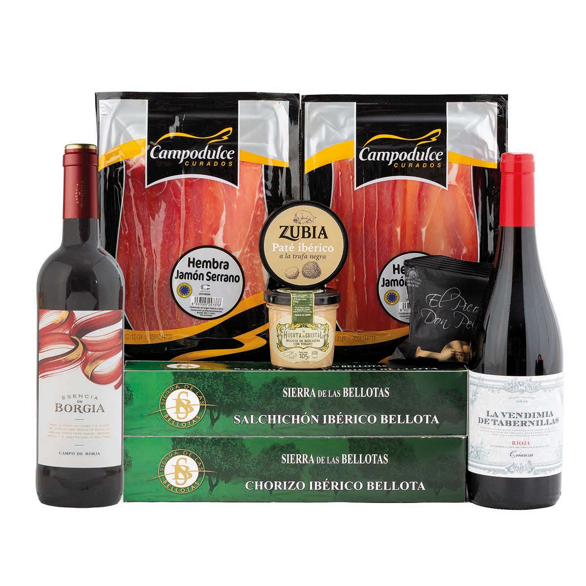 Botella 75 cl. Vino Blanco Verdejo Frizzante 5.5% FRESKITO ( 1 ud )Botella 75 cl. Vino D.O. Rioja Tinto Crianza AÑARES ( 1 ud )Barra 100 gr. Chocolate Crujiente «Calidad Suprema» EL ALMENDRO ( 1 ud )Estuche 103 gr. Bombones «Caja Roja» NESTLE ( 1 ud )Sobre 70 gr. Paleta Ibérica Loncheada «Dehesa de Extremadura» SIERRA DE AZUAGA ( 1 ud )Tarro 180 gr. Terrine de Pato Gourmet al Vino Riesling COMTE DE LA SEYNIE ( 1 ud )Caja Cartón ( 1 ud )