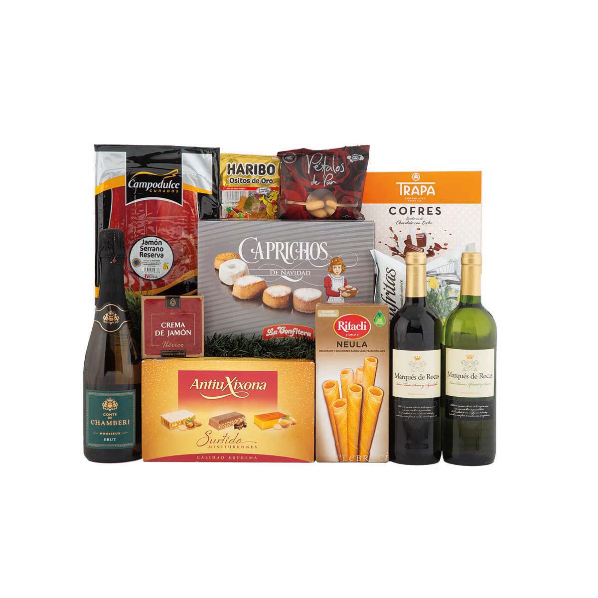 Botella 75 cl. Brut Francés COMTE DE CHAMBERI ( 1 ud )Botella 75 cl. Vino Tinto Joven MARQUES DE ROCAS ( 1 ud )Botella 75 cl. Vino Blanco Joven MARQUES DE ROCAS ( 1 ud )Botella 75 cl. Vino D.O. Campo de Borja Tinto «Viña Borgia» BODEGAS BORSAO ( 1 ud )Barra 100 gr. Chocolate Crujiente «Calidad Suprema» EL ALMENDRO ( 1 ud )Estuche 150 gr. Surtido de Turrones Calidad Suprema «Etiqueta Roja» ANTIU XIXONA ( 1 ud )Estuche 100 gr. Biscuits de Canela LA CONFITERA ( 1 ud )Bolsa 25 gr. Gominolas Surtidas HARIBO ( 1 ud )Estuche 150 gr. Waffer Rellenas de Café «Fortaleza» FLORBU ( 1 ud )Estuche 53 gr. Bombones de Chocolate con Leche «Cofres» TRAPA ( 1 ud )Bolsa 25 gr. Pétalos de Pan con Aceite de Oliva DAVID DE CASTRO GOURMET ( 1 ud )Sobre 55 gr. Jamón Serrano Gran Reserva CAMPODULCE ( 2 ud )Tarrina 70 gr. Crema de Jamón Ibérico ESENCIA Y SABOR ( 1 ud )Caja de Cartón ( 1 ud )