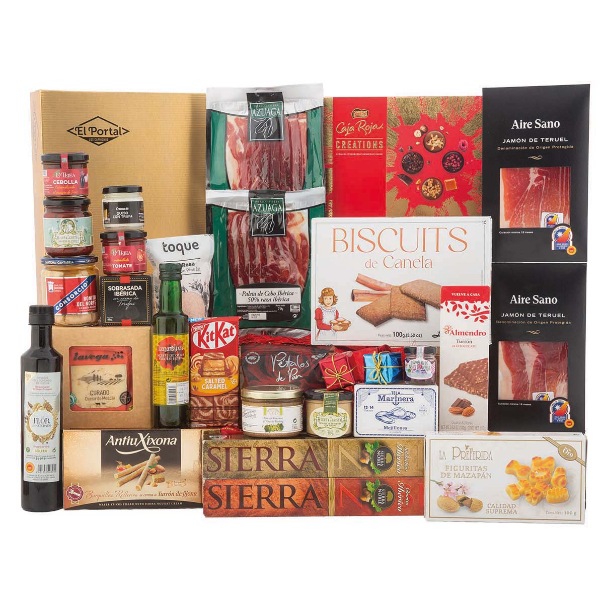 Botella 75 cl. Cava Brut Ecológico»Vintage» CODORNIU ( 1 ud )Botella 75 cl. Sidra Asturiana Dulce «Ecológica» M.BUSTO ( 1 ud )Botella 75 cl. Vino D.O. Rioja Tinto «Orgánico» FAUSTINO ( 1 ud )Barra 200 gr. Turrón Jijona Calidad Suprema «Etiqueta Negra» ANTIU XIXONA (Producto 100% Natural, sin Aditivos) ( 1 ud )Barra 200 gr. Turrón Alicante Calidad Suprema «Etiqueta Negra» ANTIU XIXONA (Producto 100% Natural, sin Aditivos) ( 1 ud )Estuche 240 gr. Torta de Aceite de Oliva Virgen Extra FLORBU ( 1 ud )Tableta 100 gr. Chocolate Negro con Flor de Sal PANCRACIO ( 1 ud )Bolsa 150 gr. Nuez Natural con Cáscara Selección PRUNITA ( 1 ud )Paquete 150 gr. Café Molido Artesano 100% Natural EL PORTAL ( 1 ud )Sobre 70 gr. Paleta Ibérica Loncheada «Dehesa de Extremadura» SIERRA DE AZUAGA ( 2 ud )Sobre 80 gr. Jamón de Teruel D.O.P. Loncheado «Luxe» AIRE SANO ( 2 ud )Lata 111 gr. Navajas al Natural «Selección» TELA MARINERA ( 1 ud )Lata 69 gr. Mejillones en Escabeche 10-14 Piezas Origen España «Selección» TELA MARINERA ( 1 ud )Lata 75 gr. Ventresca de Atún en Aceite TELA MARINERA ( 1 ud )Tarro 370 ml. Tomate Natural «Especial Tostadas» LA TEJEA ( 1 ud )Tarro 345 gr. Espárrago Blanco 6/12 Frutos ANDRES BAIGORRI ( 1 ud )Tarro 105 gr. Mousse de Berenjena con Yogurt LA HUERTA DE CRISTAL ( 1 ud )Tarro 100 gr. Paté de Aceituna Negra «Empeltre» ISMAEL ( 1 ud )Aceitera 25 cl. Aceite de Aragón Oliva Virgen Extra SOMONTANO ( 1 ud )Botella 50 cl. Vinagre del Condado de Huelva D.O. LA FLOR DEL CONDADO ( 1 ud )Pack Maridaje compuesto por: ( 1 ud ) ( – 1 Tarro 295 gr. Lomos de Bonito del Norte en Aceite de Oliva CONSORCIO ud ) ( – 1 Tarro 135 ml. Fusión de Cebolla Caramelizada al Vinagre de Jerez LA TEJEA ud ) ( – 1 Tarro 190 gr. Pimientos del Piquillo Artesanos Extra LA HUERTA DE CRISTAL ud )Estuche Lujo ( 1 ud )